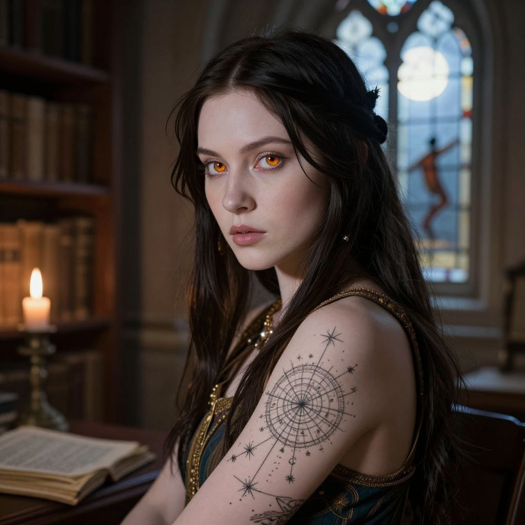 Craft a Renaissance-inspired portrait photograph capturing the intense gaze of a young Native American woman with striking amber eyes and an intricate celestial map tattoo on her right forearm. Depict this ethereal subject from a dramatic three-quarter view, showcasing exquisite details in her porcelain skin illuminated by warm candlelight emanating from a distant window. Set against a subtle backdrop evoking an ancient library's grandeur, the scene is bathed in moonlight filtering through stained glass windows, casting a soft glow on towering bookshelves and archaic manuscripts, creating an emotional gradient that balances reverence and intrigue in this meticulously detailed portrait.