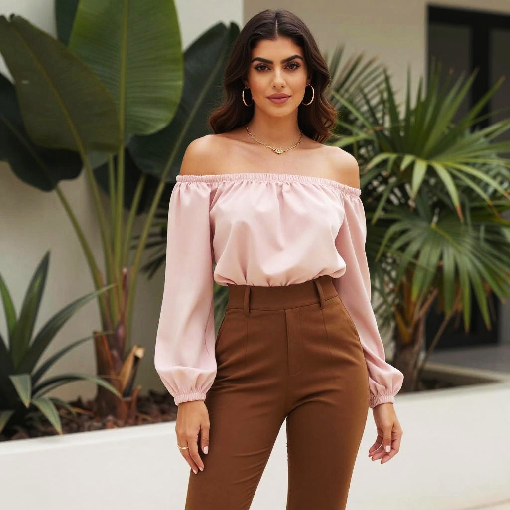 A stylish woman stands confidently in a chic outfit, featuring an off-shoulder pink blouse paired with high-waisted brown pants. The backdrop includes lush green plants, adding a touch of elegance to the modern setting, perfect for fashion-themed visuals.