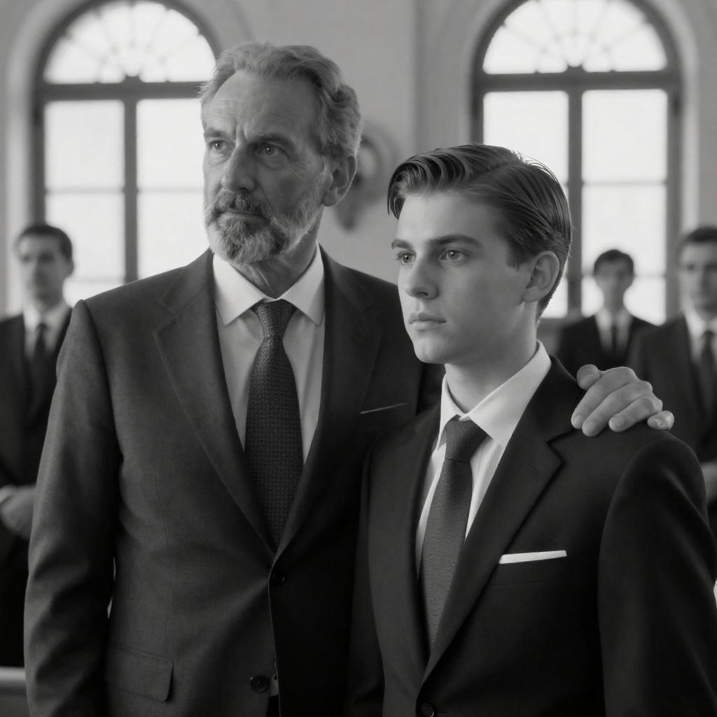 Photograph of a young man in a black tuxedo with a white shirt and black bow tie, holding the lapel of an older man dressed in a brown suit, white shirt, and orange tie. The older man has a serious expression. Both men have short hair and stand against a blurred indoor background.