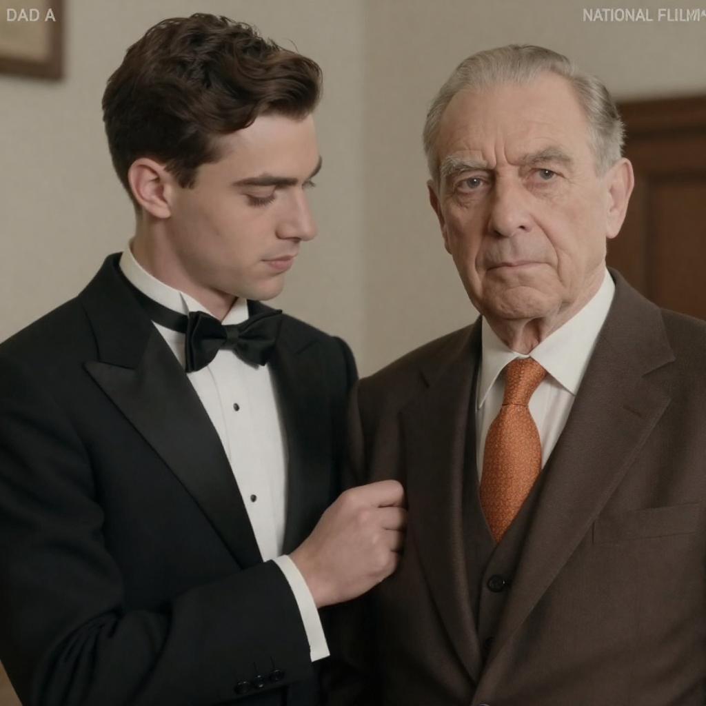 Photograph of two men in formal attire. Young man in black tuxedo with white shirt and black bow tie, gripping older man's lapel. Older man in brown suit, white shirt, orange tie. Both have short dark hair. Older man's expression is serious. Background is blurred. " Dag" and "A just National Film" in top corners.