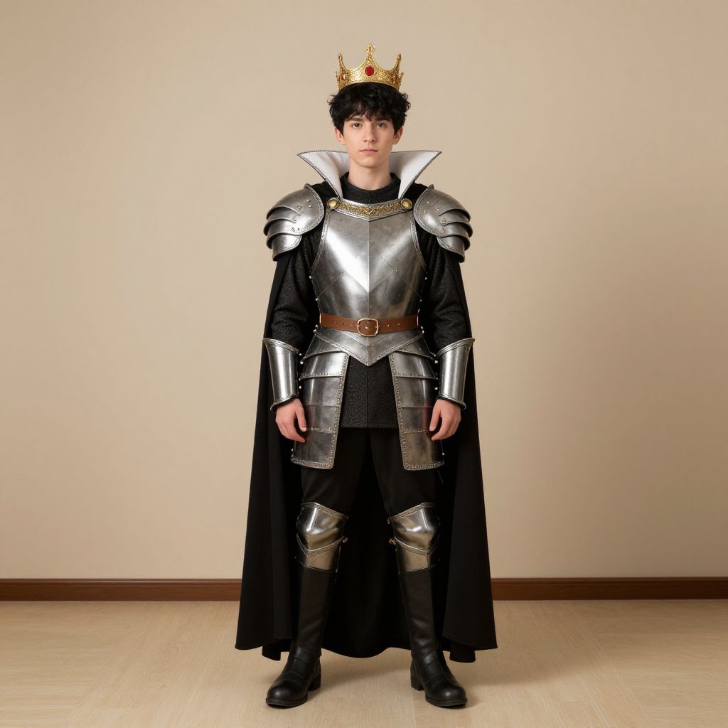 King hearts costume man, crown, solo, 1boy, male focus, black hair, looking at viewer, realistic, blurry, upper body, blurry background, jewelry, green eyes, facial hair