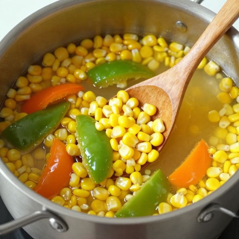 Golden corn kernels and vibrant green and orange bell pepper pieces simmer in a rich broth inside a stainless steel pot, stirred gently by a wooden spoon, creating a warm and aromatic Winter Simmer Pot Recipe that naturally fills the home with delightful scents.