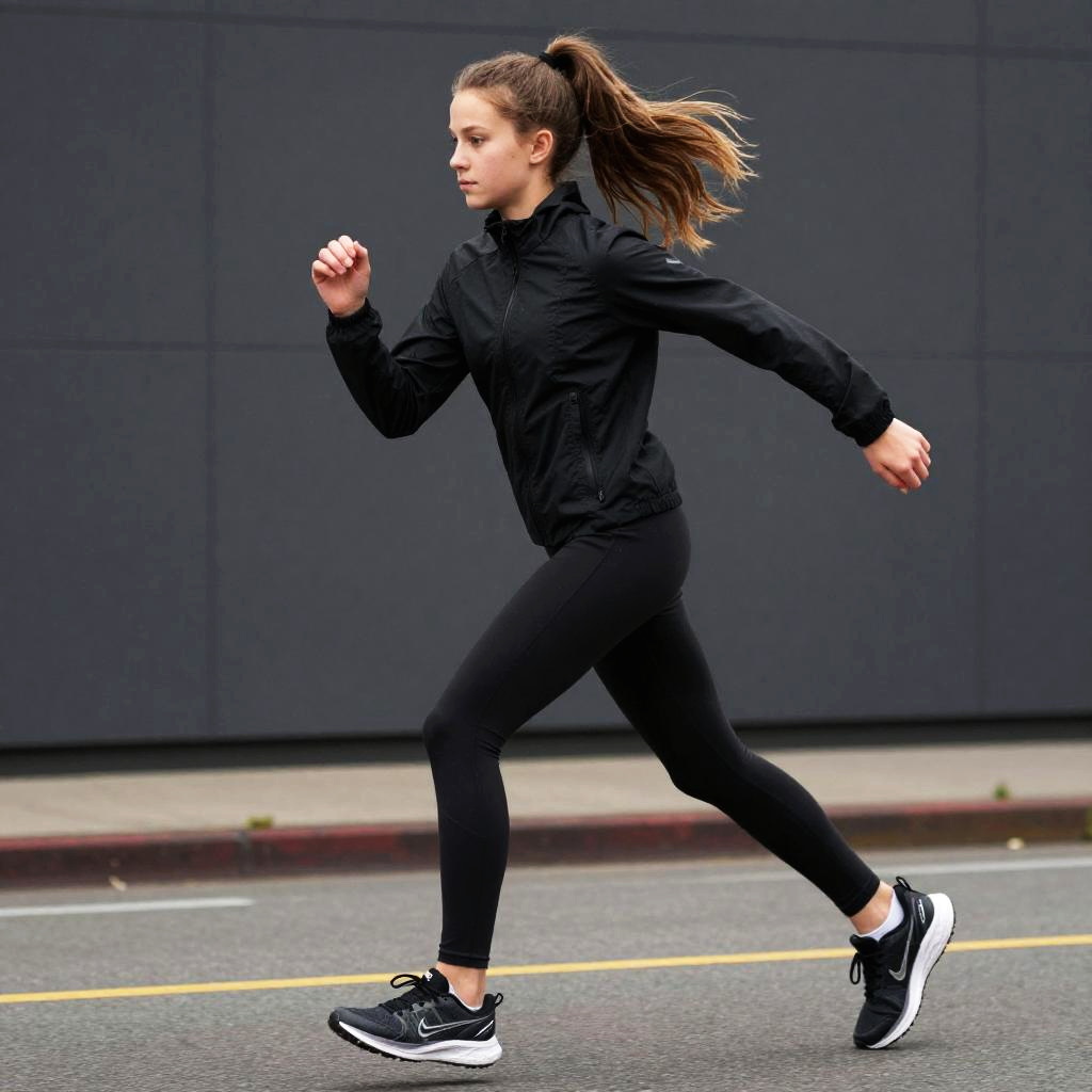 Teenage girl, Athletic Build, High Ponytail, kelsey plum outfit, sports jacket, leggings, running shoes, dynamic sports