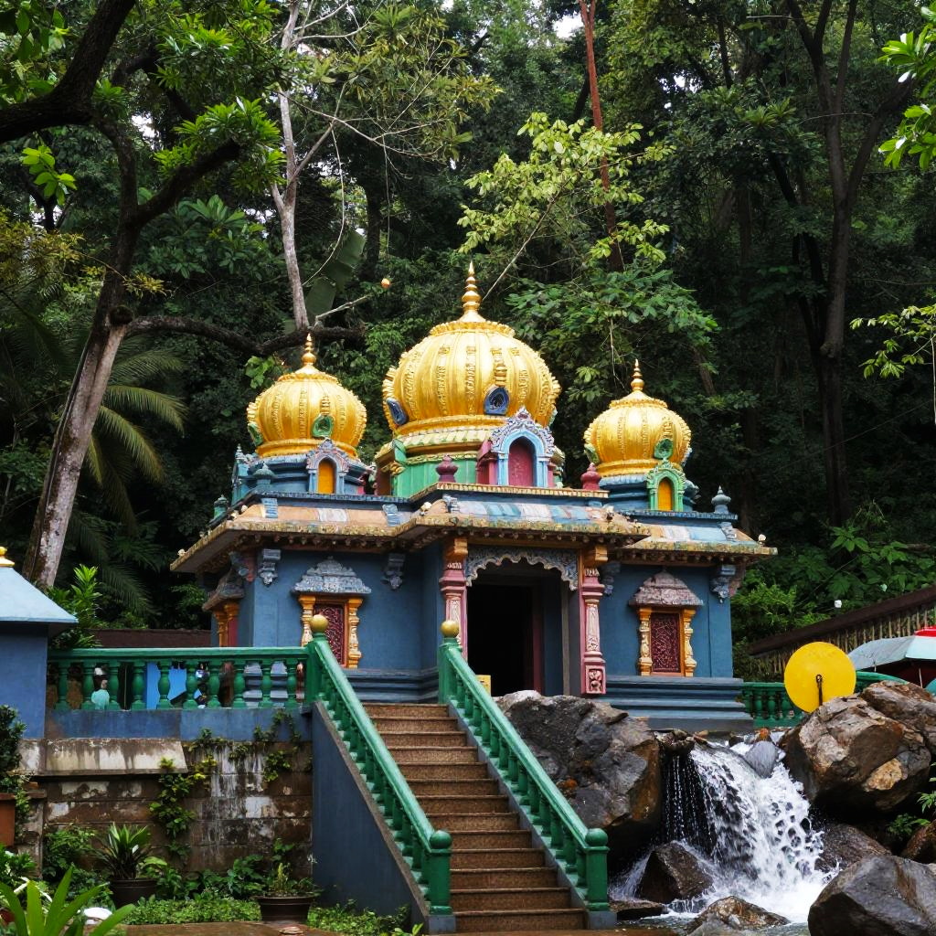 Photograph of a colorful Hindu temple nestled in a lush green forest. The temple has three ornate, golden-yellow domes with intricate carvings, and a staircase with green railings leads up to the entrance. To the right, a small waterfall cascades over rocks, with a yellow circular object visible nearby. The background is dense with tall trees, creating a serene, natural setting.
