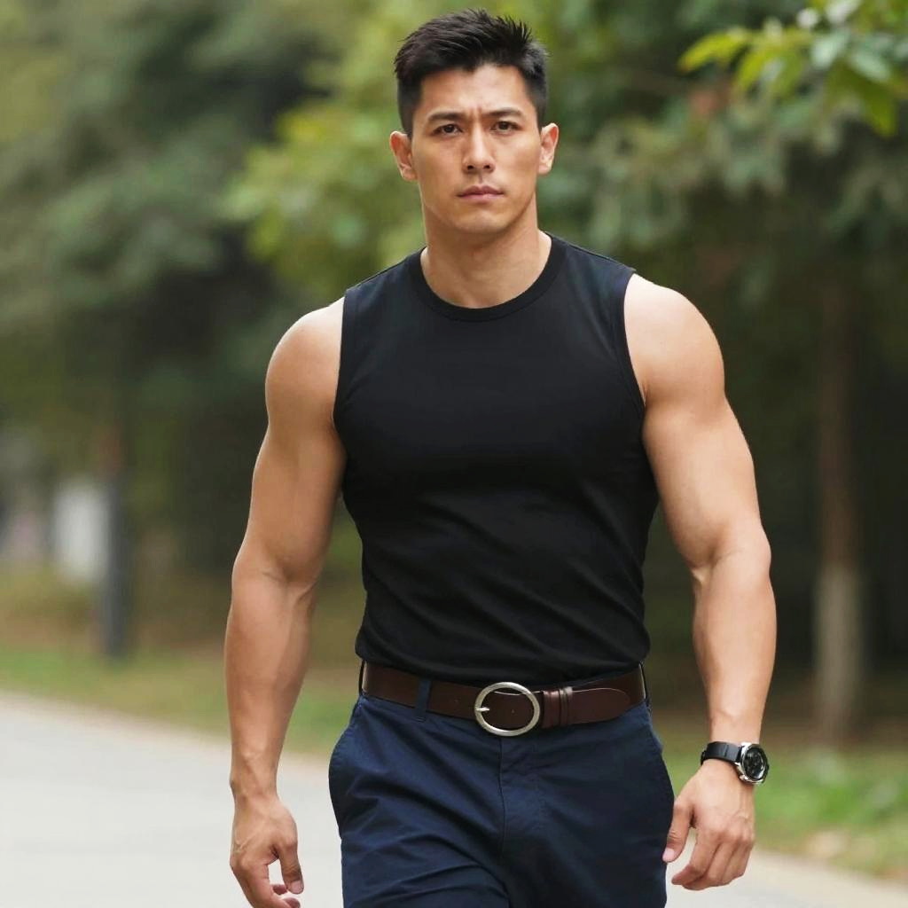 Photograph of a muscular Asian man with short black hair, wearing a black sleeveless shirt, black pants, brown belt, and black watch, walking