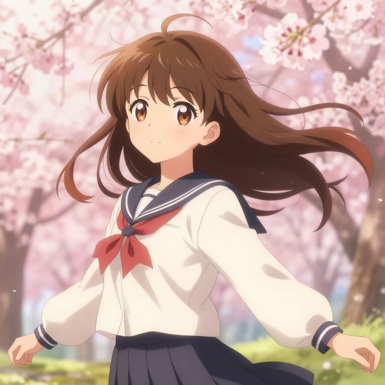 Brown hair anime character standing in a vibrant cherry blossom park, large expressive eyes reflecting sunlight, detailed flowing hair strands, soft pastel color palette, intricate school uniform, warm serene atmosphere, dynamic pose with gentle breeze