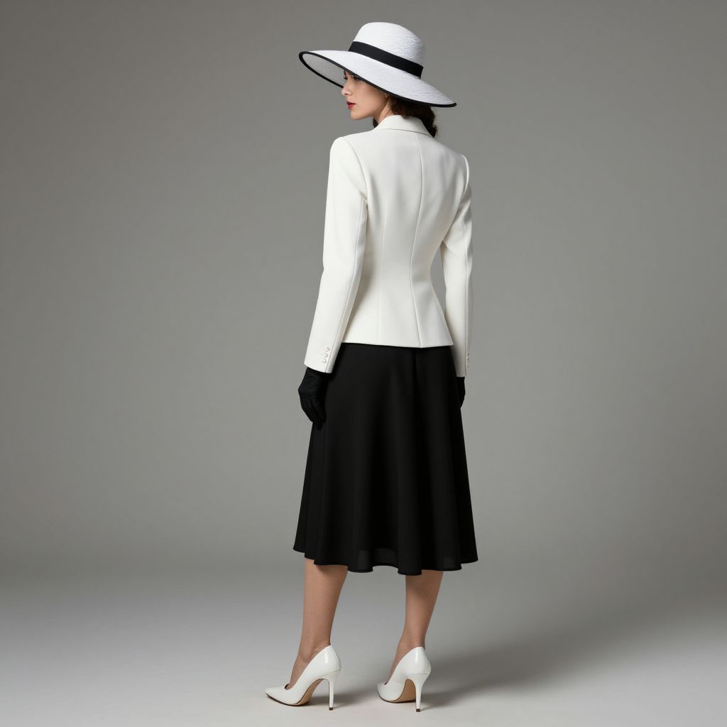 Elegant woman standing with her back turned, showcasing a stylish ensemble featuring a crisp white blazer with structured shoulders, a flowing black knee-length skirt, white stiletto heels, black gloves, and a wide-brimmed white hat accented with a black band.