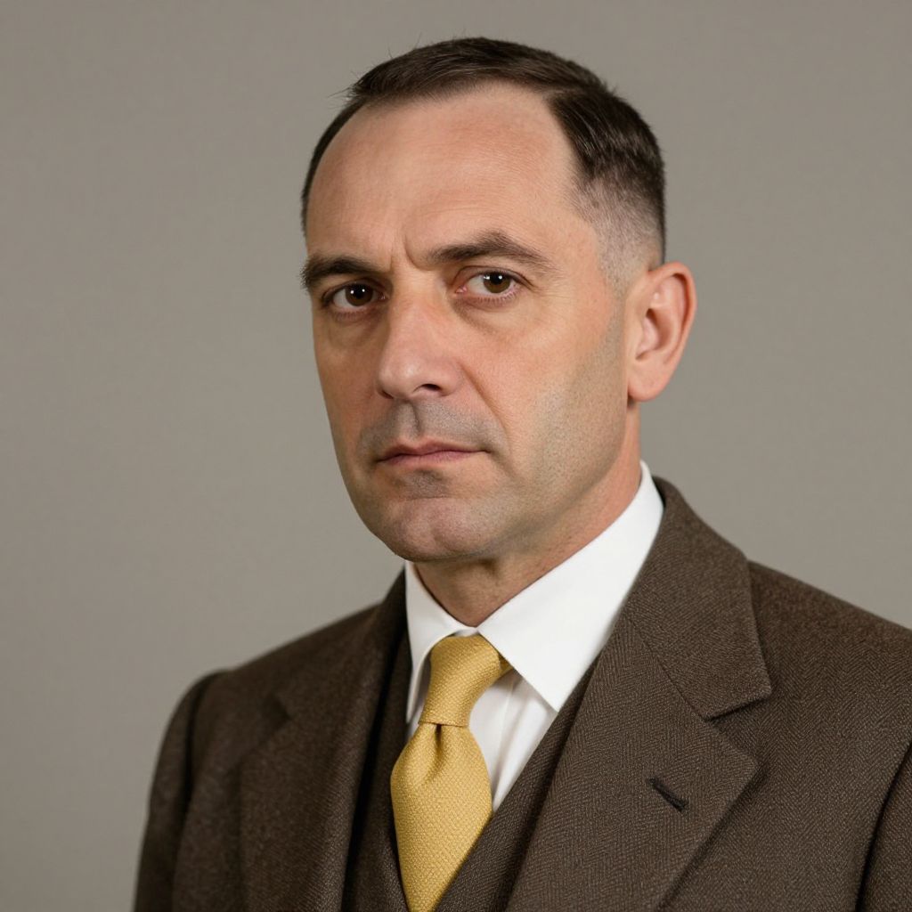 A middle-aged man with a clean-shaven haircut, wearing a 1920s business suit with a white shirt and a yellow tie.