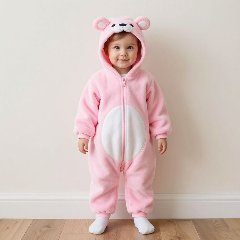 "Tinky Winky Onesie, in a pink onesuit standing in front of a wall"