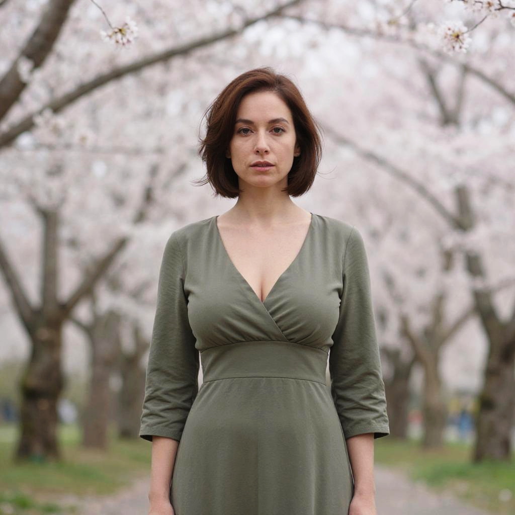 A woman in a minimalist olive green dress, three-quarter sleeves, standing in a cherry blossom grove, captured in the style of Chromogenic film. Sexy. Pretty face and beаutiful eyes. Big breasts