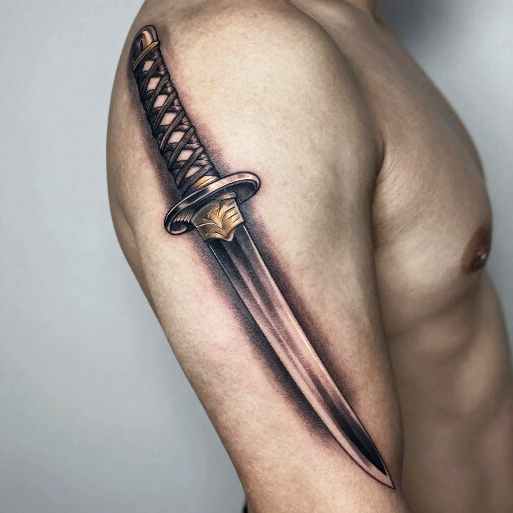 Realism sword tattoo on upper arm, showcasing a samurai katana with razor-sharp edge, polished blade reflecting soft light, traditional wrapped handle, realistic skin shading with depth, hyper-detailed black and white ink tattoo design, striking and powerful.