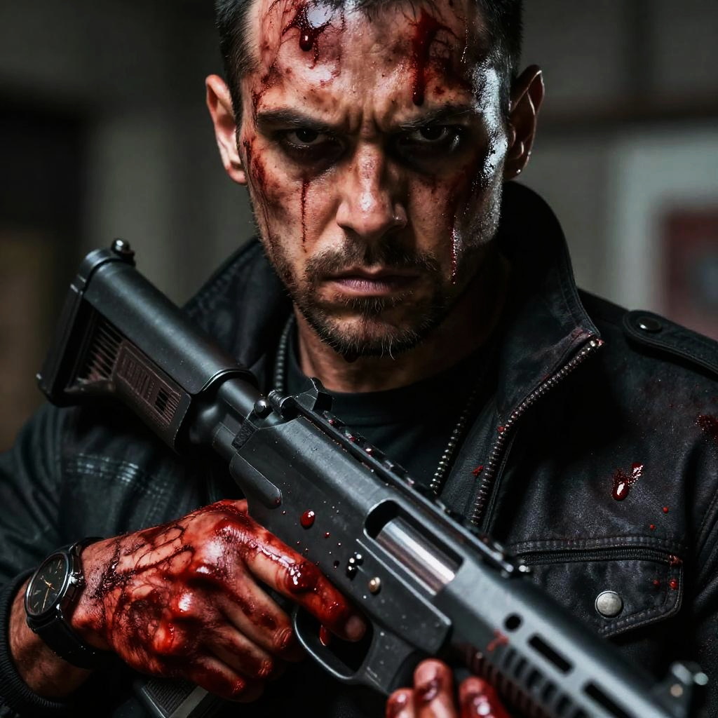 Cartel.gore close-up of a merciless cartel enforcer with blood-stained hands holding a weapon, intense facial expression, dramatic contrast lighting, detailed blood effects, gritty and raw urban crime art, hyper-realism mixed with dark surrealism