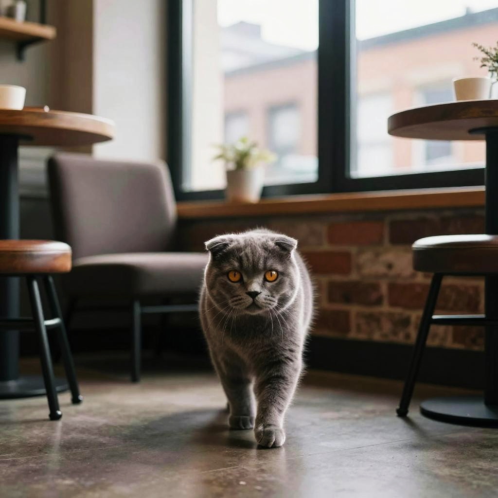 Sleek dark gray Scottish Fold cat with round amber eyes confidently walking toward the viewer across urban chic coffee corner accented by brick and iron furnishings, lit by bright natural window light from side-facing bay window. Natural textures of fur, fabric, and wood emphasized; inviting and homey atmosphere; shallow depth of field; crisp whiskers; soft vignetting; balanced composition; subtle film grain; realistic color rendering; gentle contrast; fine detail throughout.