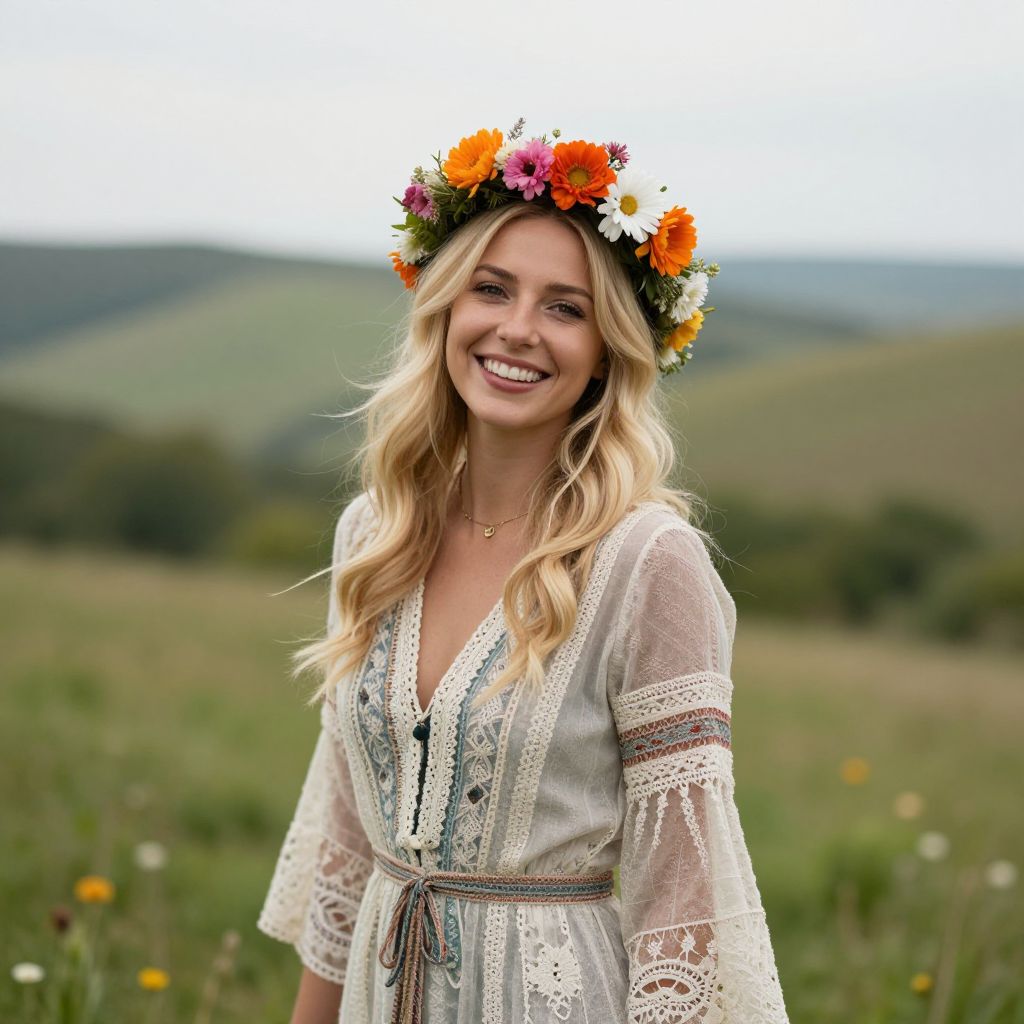 Blonde-haired woman smiling brightly while wearing a delicate boho vintage dress adorned with intricate lace detailing, complemented by a vibrant floral crown featuring orange, pink, and white blooms, set against a serene backdrop of rolling hills and lush greenery.