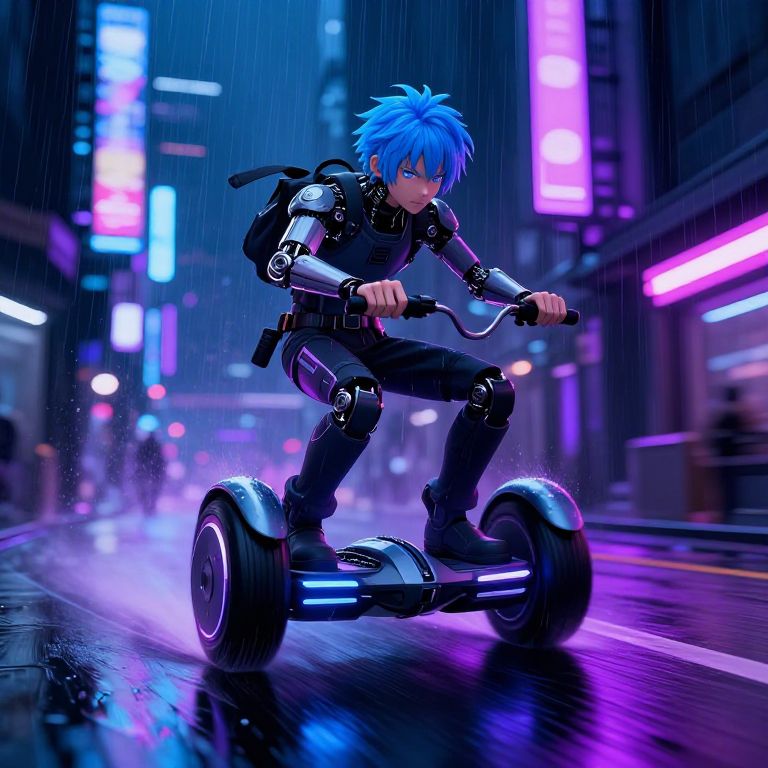 Anime boy with blue hair riding a futuristic hoverbike through a cyberpunk street, rain-soaked neon signs reflecting off wet pavement, cybernetic enhancements visible, dark urban environment with vibrant purple and blue hues, motion blur effect.