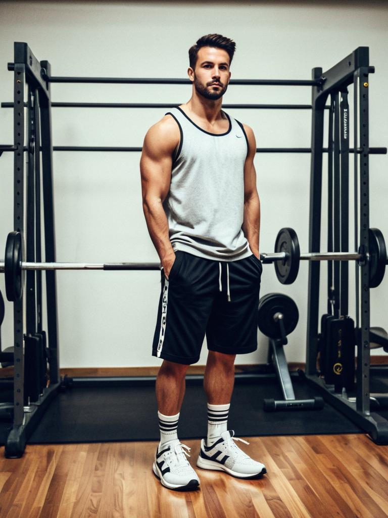 Fit young man wearing a grey sleeveless tank top, black drawstring shorts, white athletic socks, and white sneakers with black accents. He is standing confidently with hands in pockets in a gym setting, positioned in front of barbell weightlifting equipment. The indoor fitness center features wooden floors and modern exercise machines.