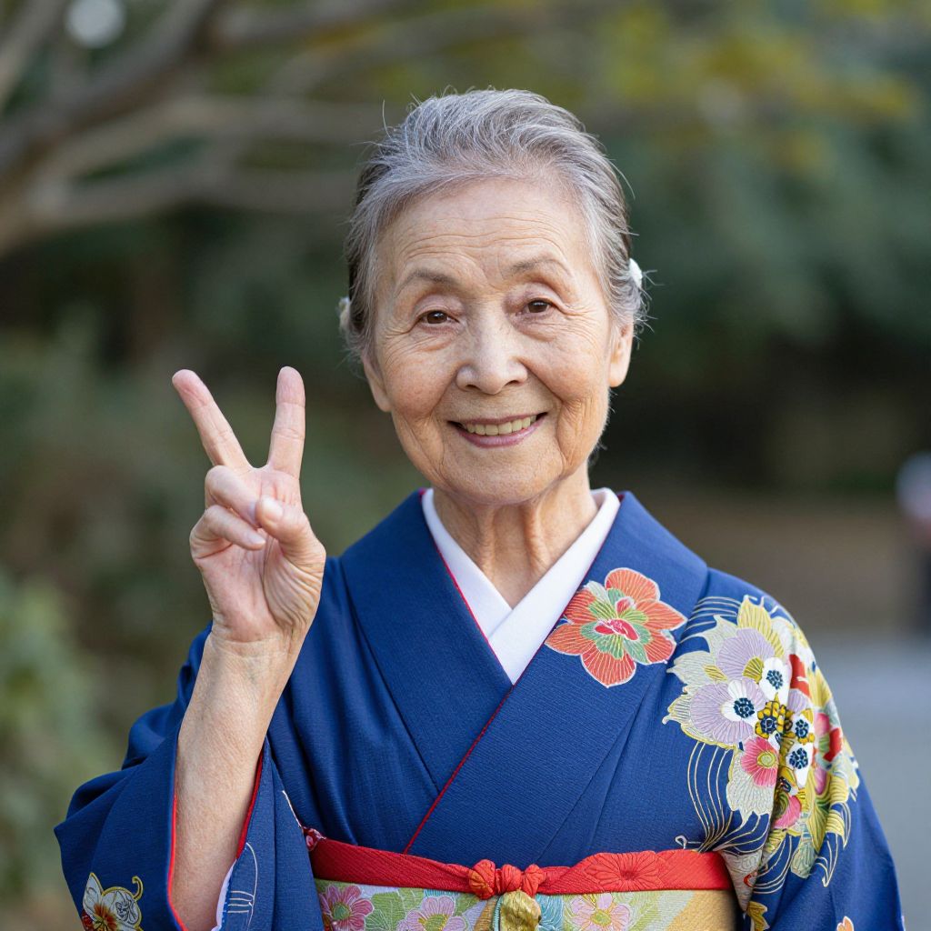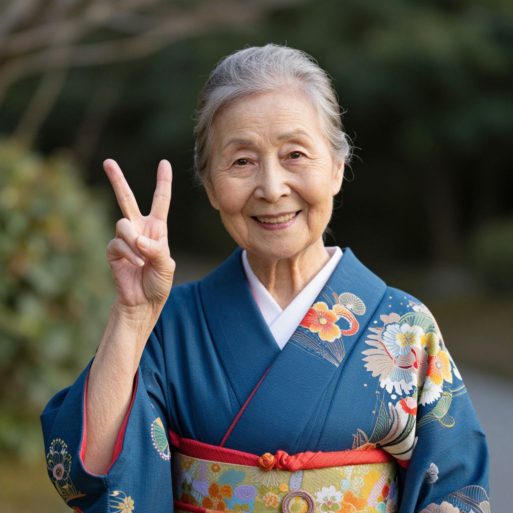 Photograph of an elderly Asian woman with gray hair, wearing a blue floral kimono, smiling and flashing a peace sign outdoors.