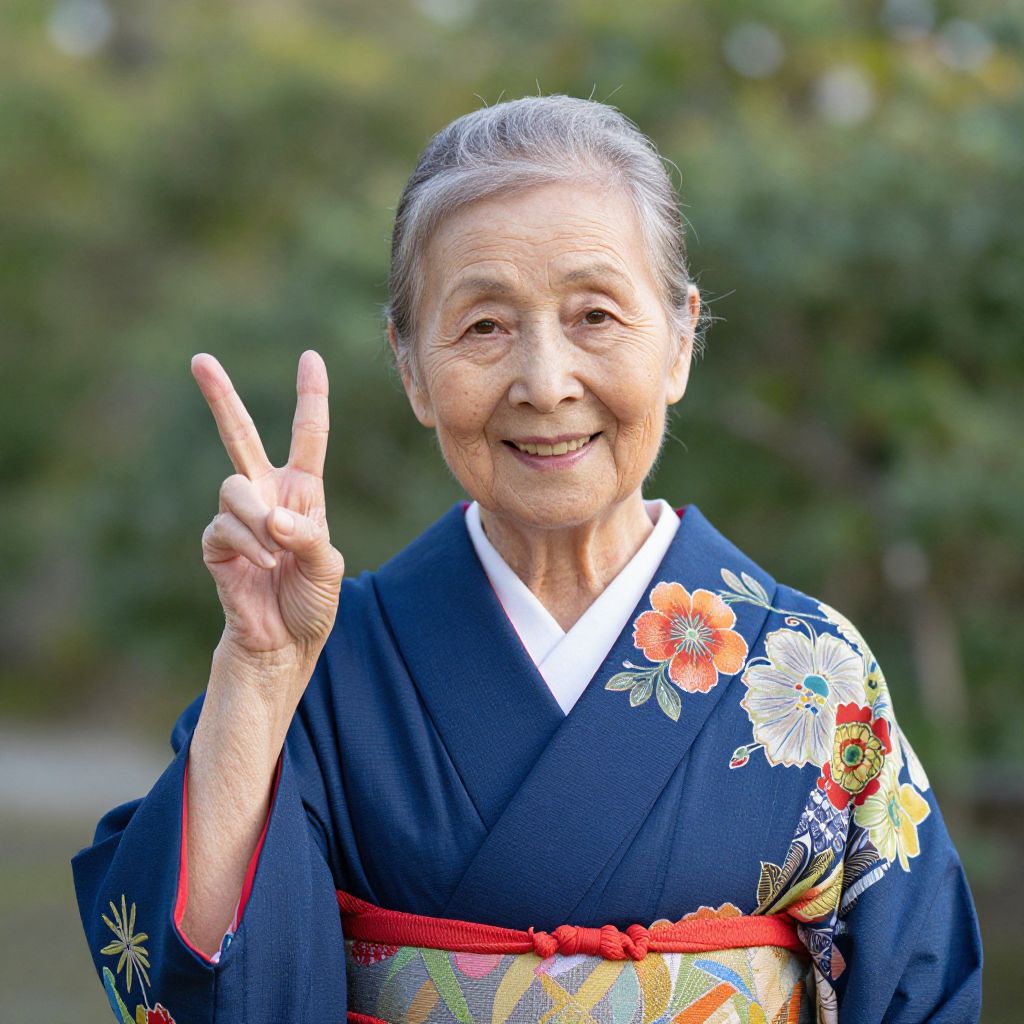 Radiant serenity and timeless joy intertwine in this portrait of an elderly Japanese woman adorned in vibrant traditional attire, her gentle smile and peace sign echoing a harmonious blend of cultural heritage and enduring optimism.
