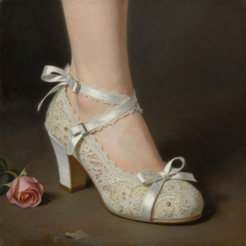 A detailed, shabby chic painting of a woman's shoe with intricate lacework and ribbons, set against a dark background with a rose nearby.