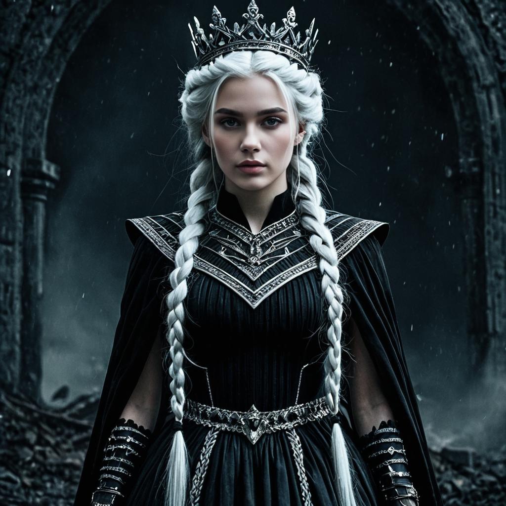 Portrait of a merfolk queen with luminescent white hair wearing a deep sapphire velvet veil adorned with shimmering pearls, standing in a misty ancient forest glade. The subject has pale skin, long wavy white hair, and wears an elaborate, pearl-embellished gown with a crown. The scene is atmospheric with fog and dense trees surrounding her, rendered in a hyperrealistic style inspired by John William Waterhouse and Alan Lee.