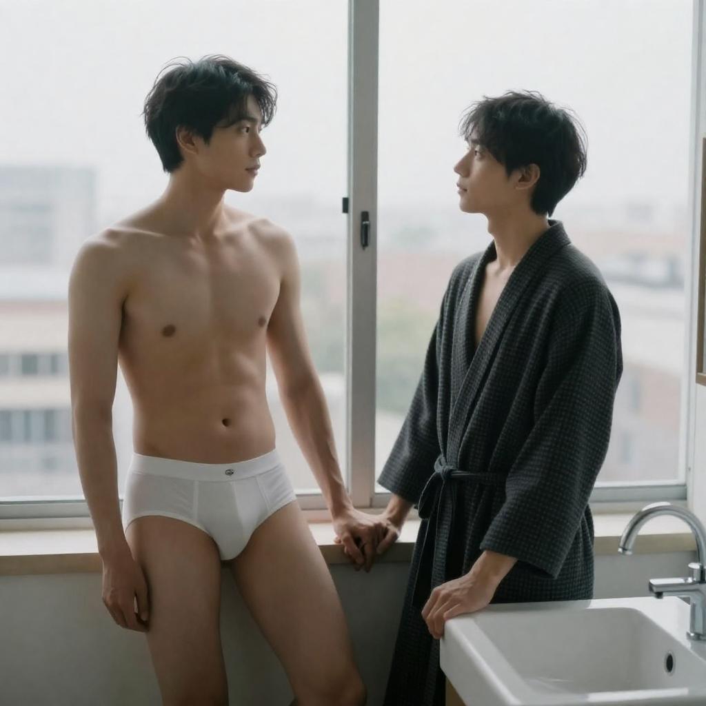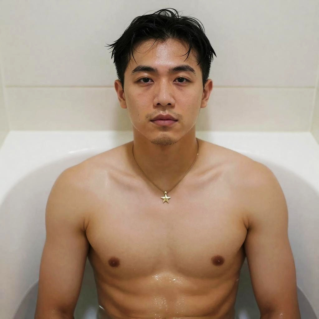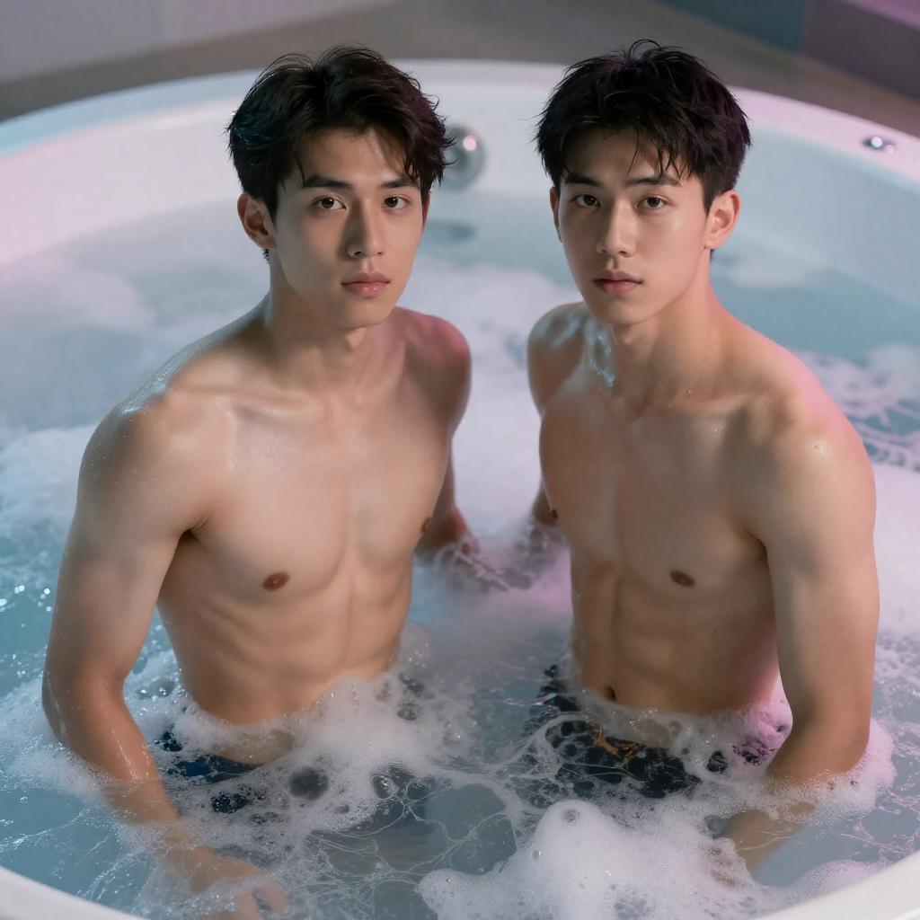 Photograph of two shirtless young men with short dark hair, standing side by side in a bubbling blue and pink bath. Both have light skin and muscular builds. They face forward with serious expressions. Foamy bubbles surround them. Blue and pink lighting creates a dynamic atmosphere.
