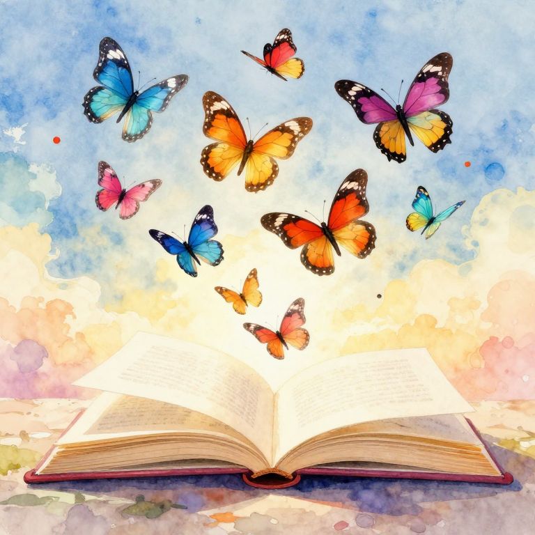 Watercolor illustration of an open book with vibrant butterflies emerging from its pages, set against a cloudy blue and yellow sky.