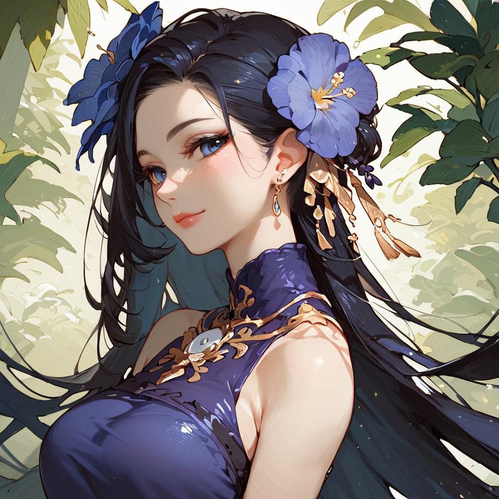 Digital anime-style portrait of a beautiful woman with long black hair, blue flower hairpiece, blue dress, and earrings, set against a bright, leaf