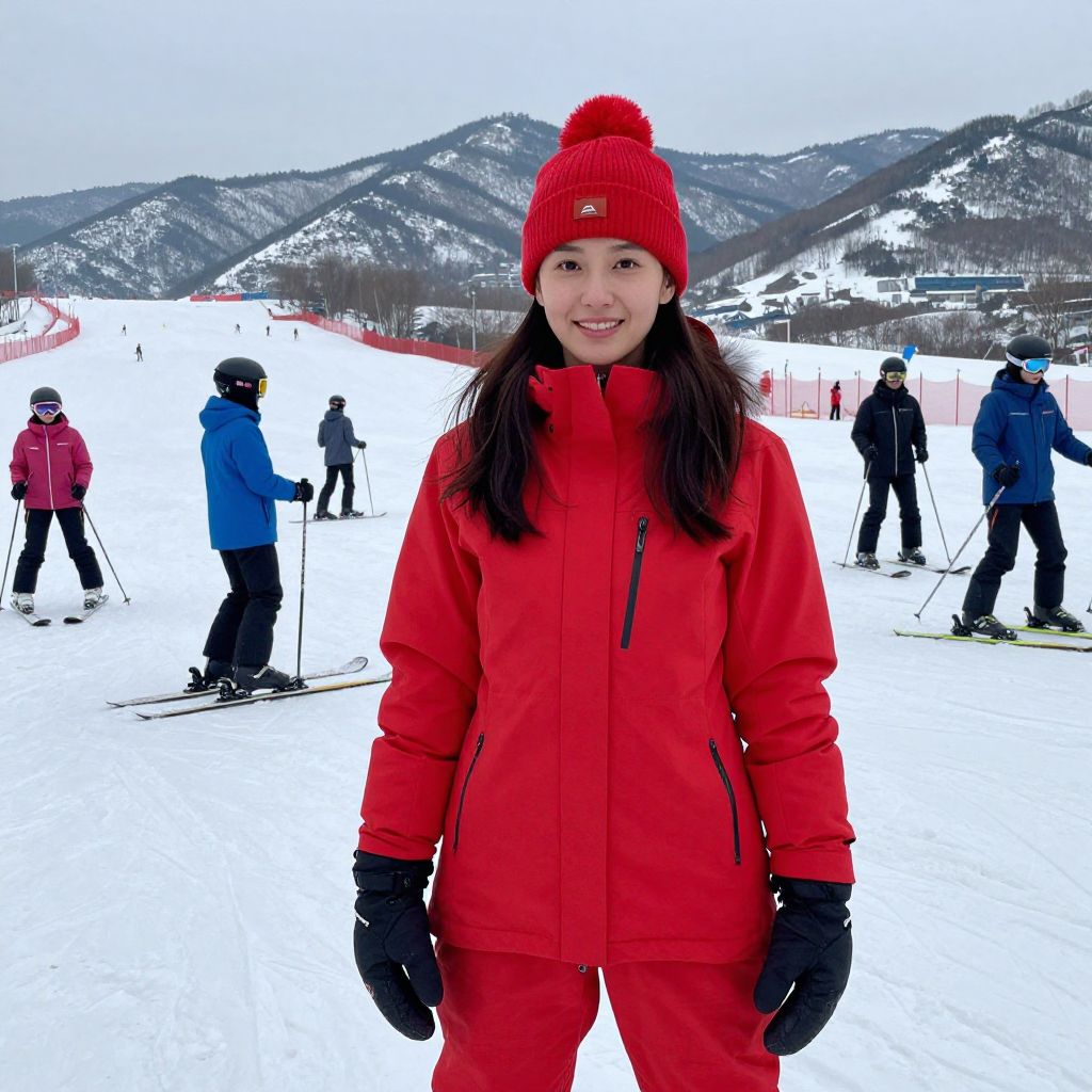 Photograph of a smiling Asian woman in her 20s standing in a snowy ski resort. She's wearing a bright red ski jacket and pants, black gloves, and a red beanie with a pom-pom. Her dark hair is loose under the beanie. In the background, several skiers in winter gear, including helmets and goggles, ski on the snow-covered ground with snow-capped mountains visible in the distance.