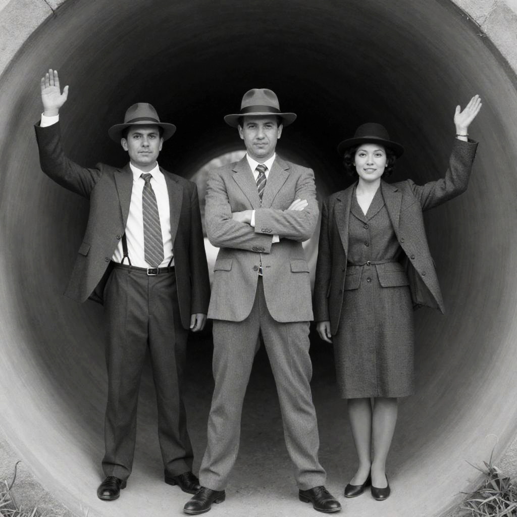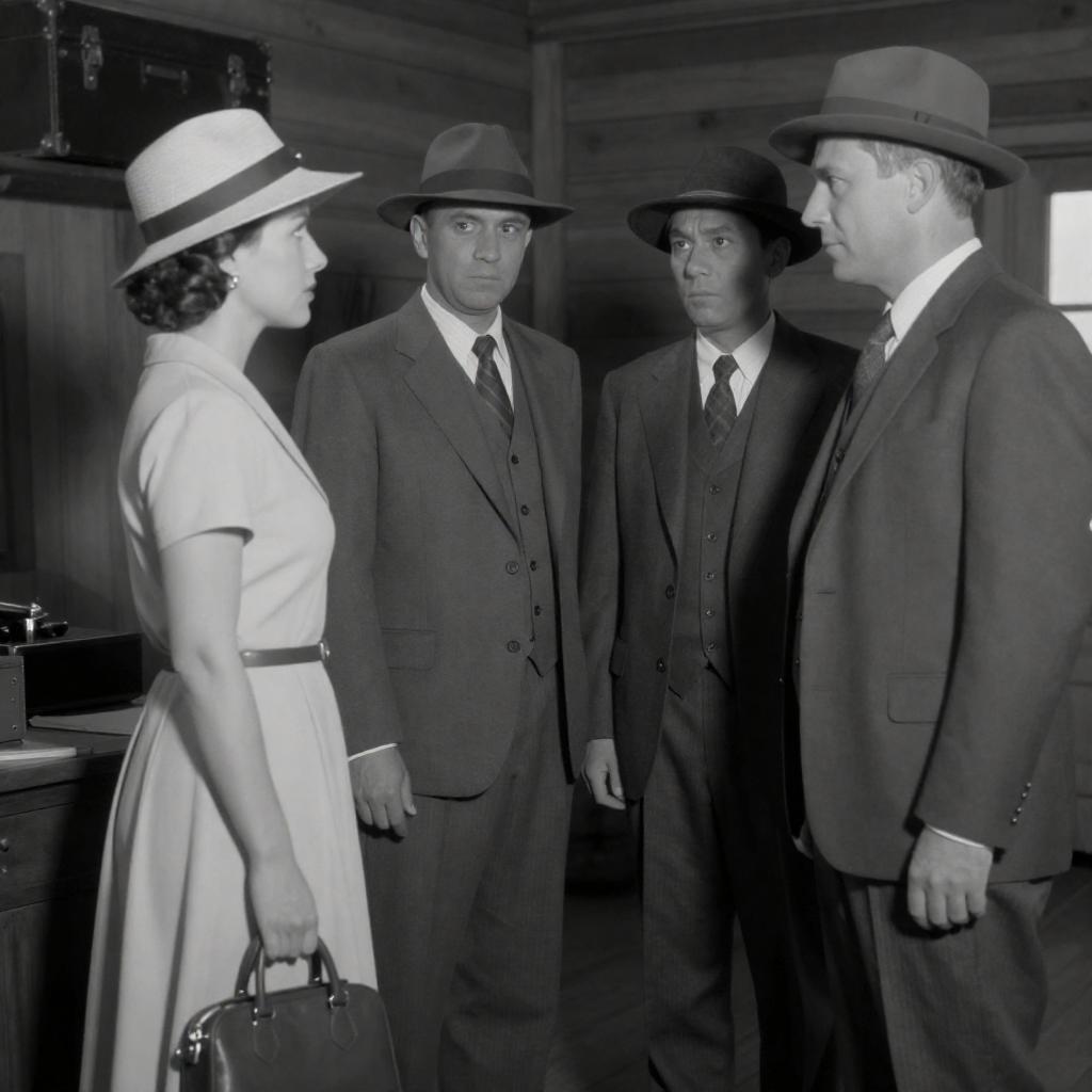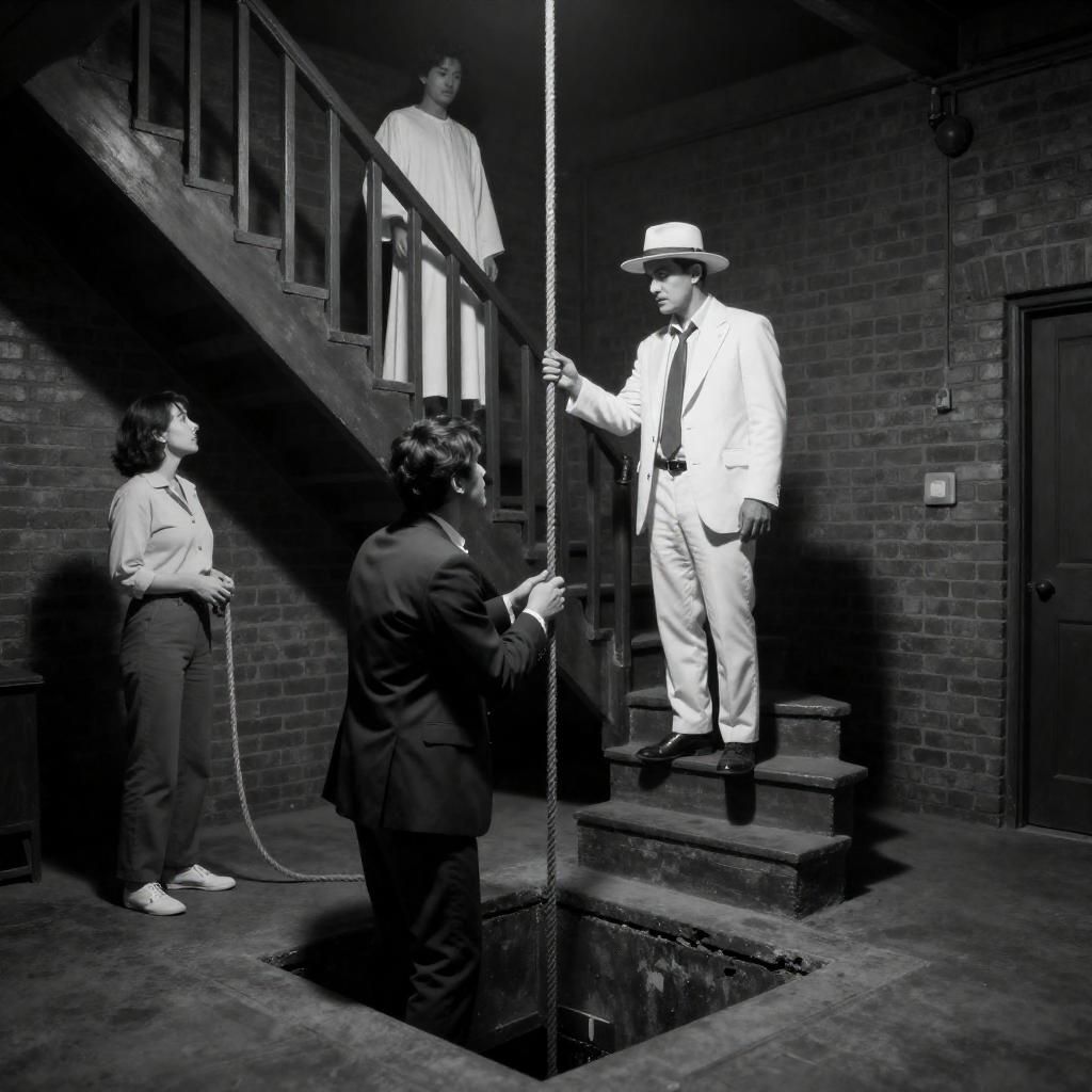 Black-and-white photograph of a movie scene. Four people in a dimly lit, brick-walled basement. Three men, one woman. Man in white suit and hat stands on stairs, gesturing. Man in dark suit lowers rope into deep pit. Woman stands to left, holding rope. Figure in white robe on higher stairs. Steep, narrow staircase. Ropes and wooden railings. Shadows and ures on walls.