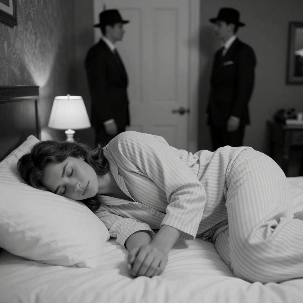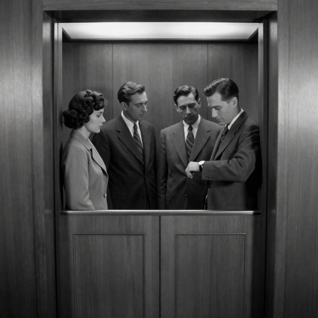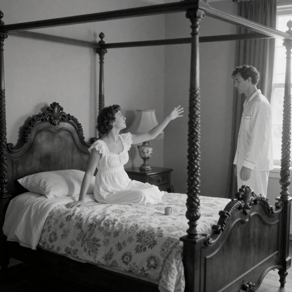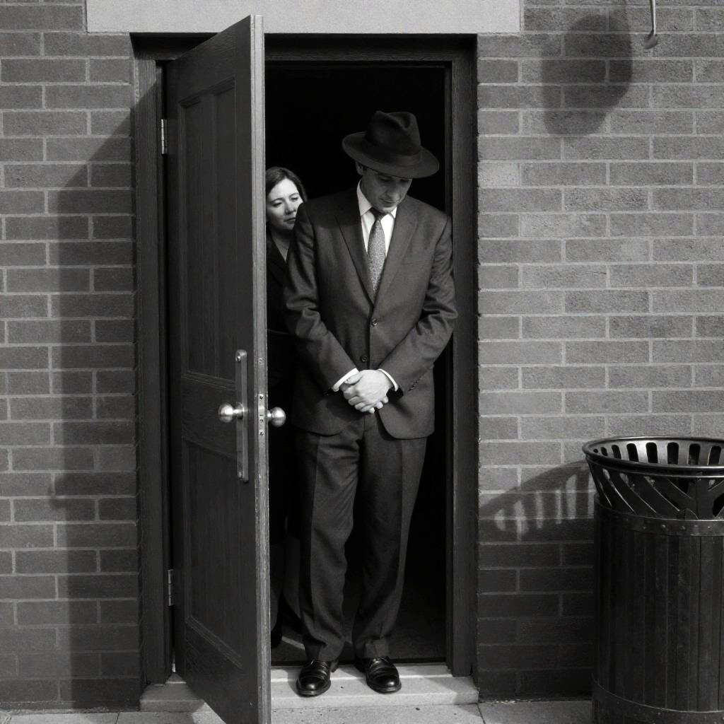 Black-and-white photograph of a movie scene. Four people in a dimly lit, brick-walled basement. Three men, one woman. Man in white suit and hat stands on stairs, gesturing. Man in dark suit lowers rope into deep pit. Woman stands to left, holding rope. Figure in white robe on higher stairs. Steep, narrow staircase. Ropes and wooden railings. Shadows and ures on walls.