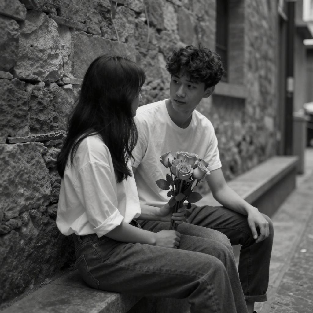 This black-and-white photo shows a young couple sitting closely together on a stone wall in a dimly lit, narrow alley. The woman, with long dark hair, is holding a small bouquet of roses and leaning slightly towards the man. He has short dark hair and is gazing at her with a soft expression. The camera angle is slightly low and to the side, creating a sense of intimacy. The background is blurred, drawing focus to the couple. The lighting is soft, with shadows adding depth.