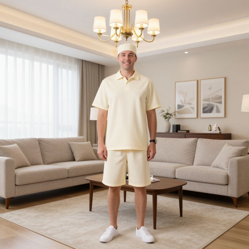Office Wear Summer Costume, man standing in a living room with a chandelier