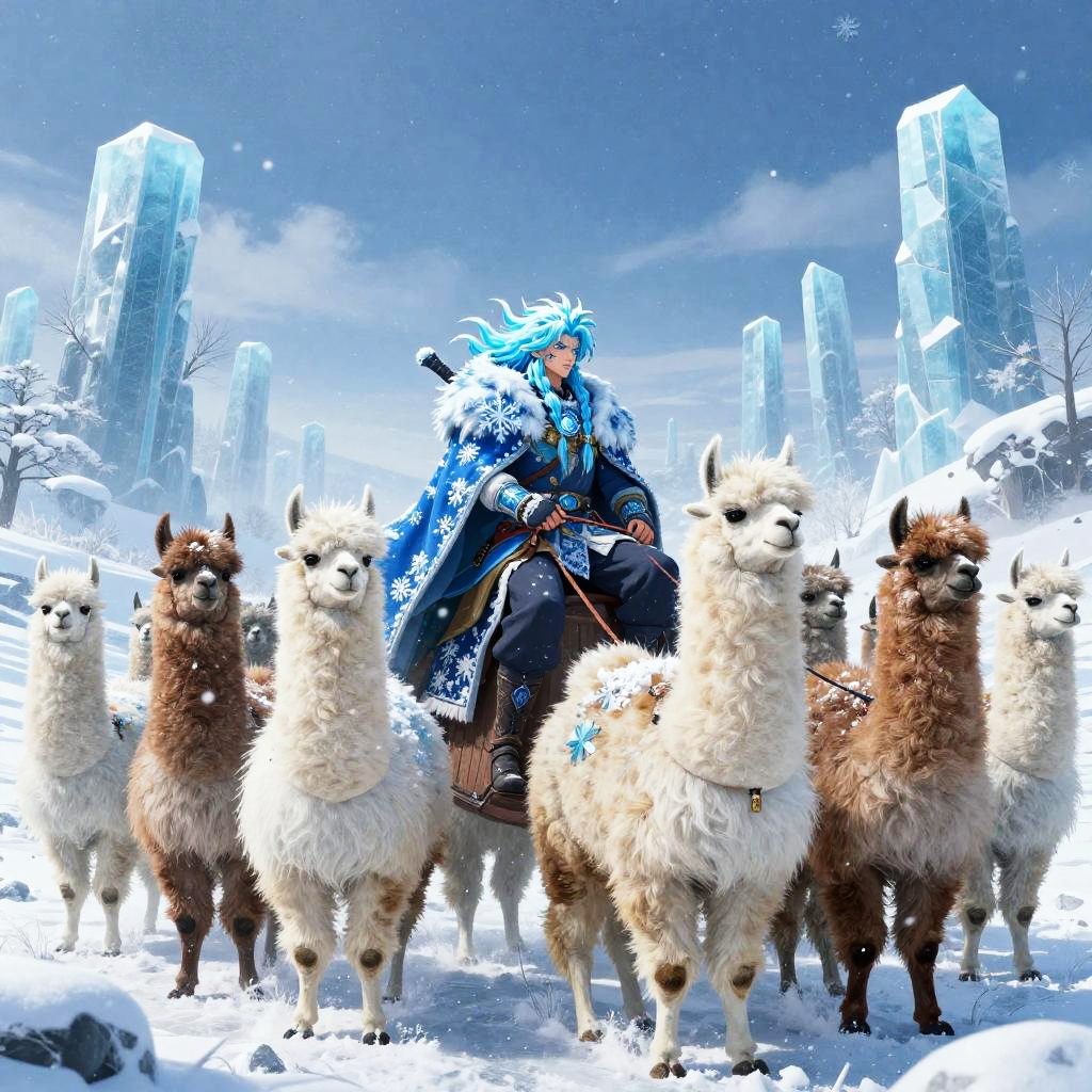 A stoic ice llama beastmaster, with icy blue hair and a cloak made of snowflakes, engaging in leading a charge through a blizzard atop giant llamas, in a vast frozen tundra dotted with ancient ice pillars, depicted in the epic and celestial style of Masami Kurumada.