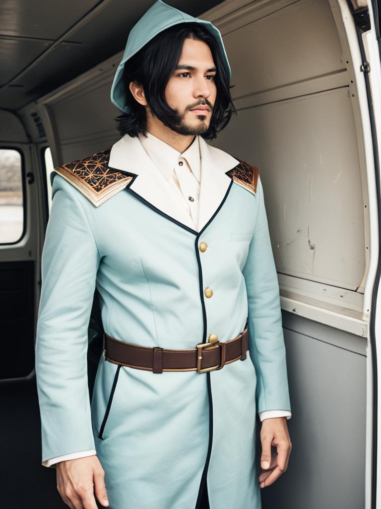 Portrait of a man in realistic Van Aifread cosplay costume featuring a light blue coat with detailed gold and black shoulder accents, white inner shirt, brown belt, and a hood. The man has medium-length dark hair and a beard, standing inside a vehicle with a neutral expression.