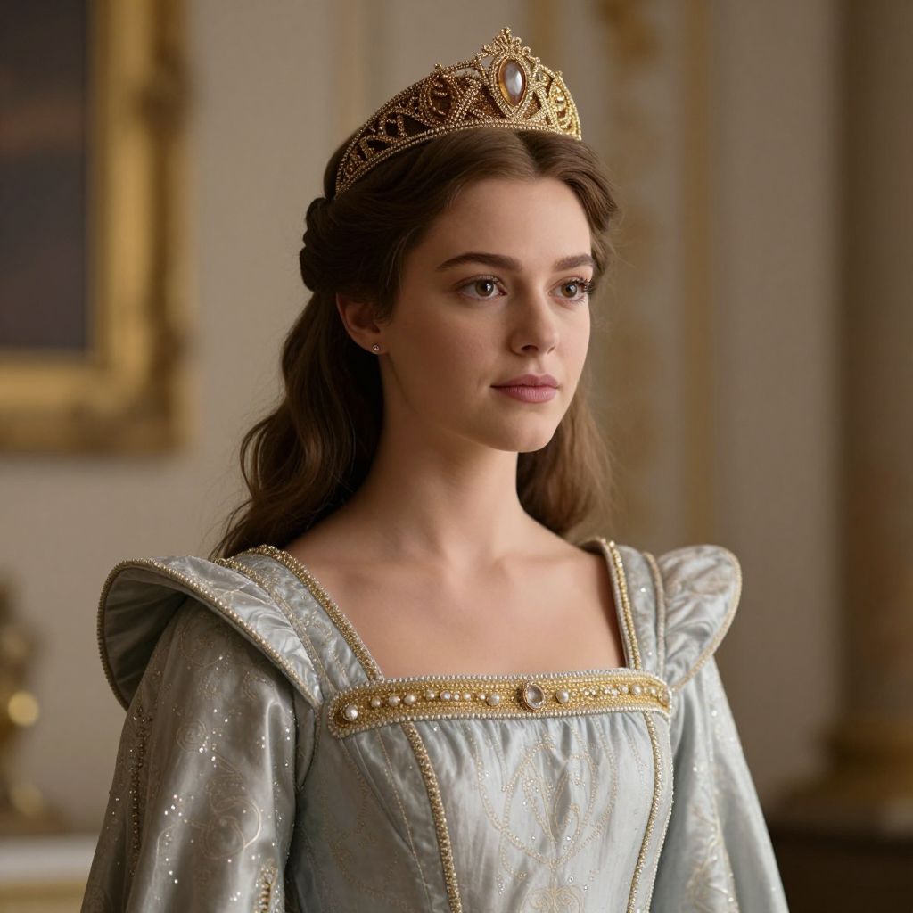 Girl Queen Guinevere Costume, a close up of a woman in a dress and crown standing in a room