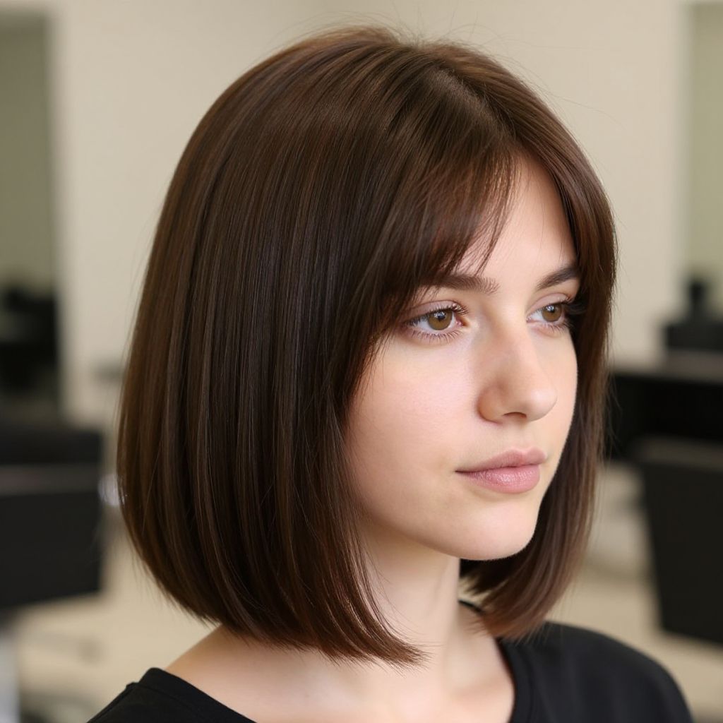 Caucasian woman with Sleek, Straight Bob with a Soft Bang hairstyle, a refined and modern classic, posing in a styled hair salon, professional ambiance, soft natural lighting, focus on symmetry and balance of the cut, elegant expression, high detail texture of hair and skin.