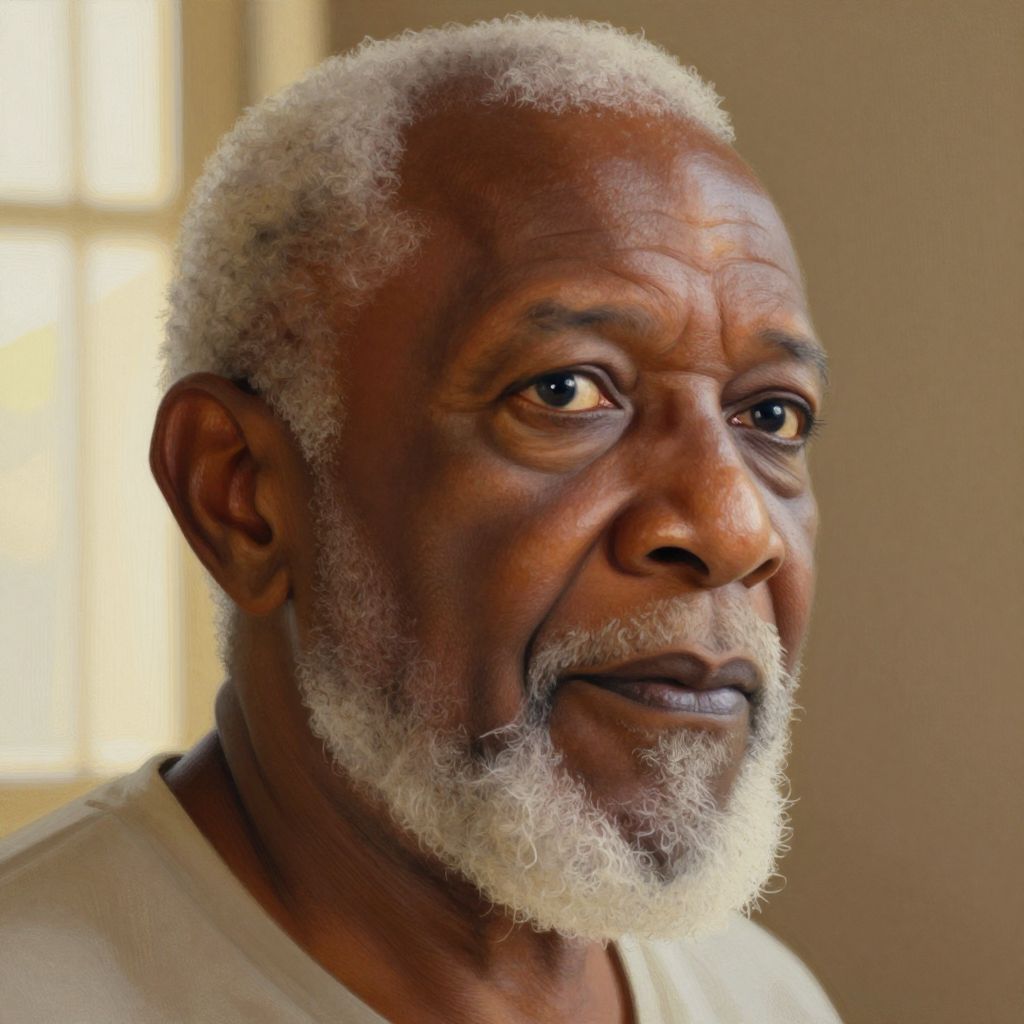 Photograph of an elderly Black man with short, curly white hair and beard, wearing a white shirt, looking thoughtfully to the side in soft,