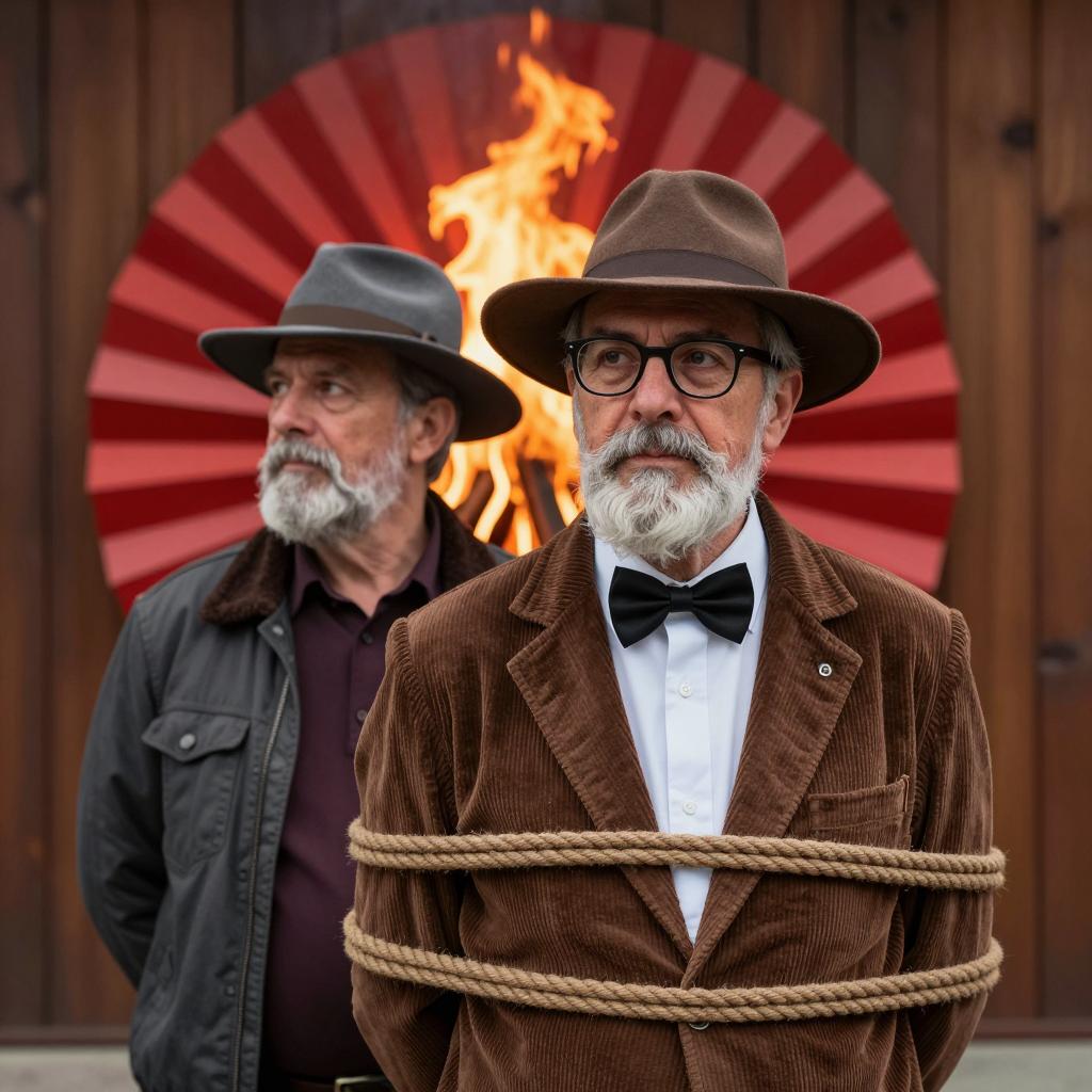 Two men in front of a wooden wall with a large red fan-shaped fire. The man in front wears a black bow tie, glasses, and a brown hat with a corduroy jacket, bound with rope around his torso. The man behind wears a gray hat and jacket, looking to the side. Both have white facial hair. The fire casts warm light.