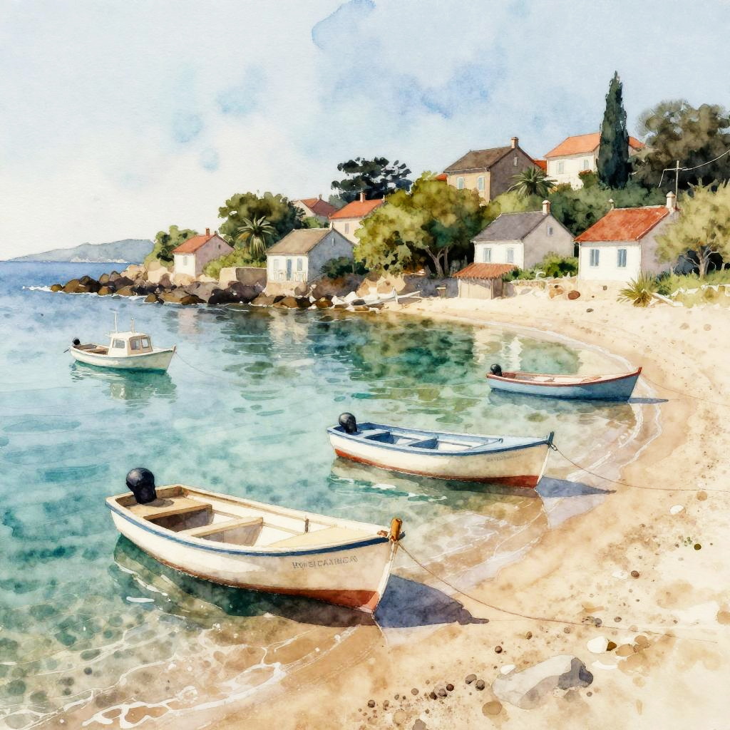 Watercolor-style painting of a serene coastal village with small white boats anchored in clear turquoise waters, surrounded by sandy shore and charming red-roofed houses
