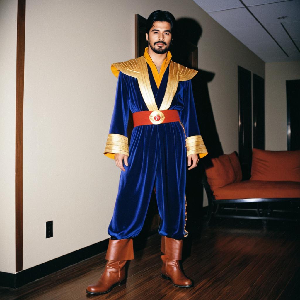 Emperors groove costume,1boy, solo, male focus, black hair, facial hair, standing, full body, boots, looking at viewer, indoors, brown footwear