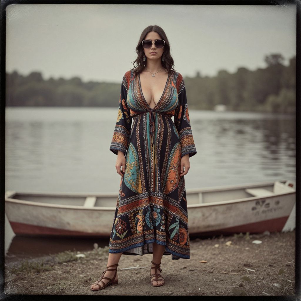 A woman, in a vibrant bohemian dress with intricate patterns, brown strappy sandals, and oversized sunglasses, captured in the visual style of a Collodion wet plate, standing by a serene lake with a boat. Sexy. Pretty face and beаutiful eyes. Big breasts.