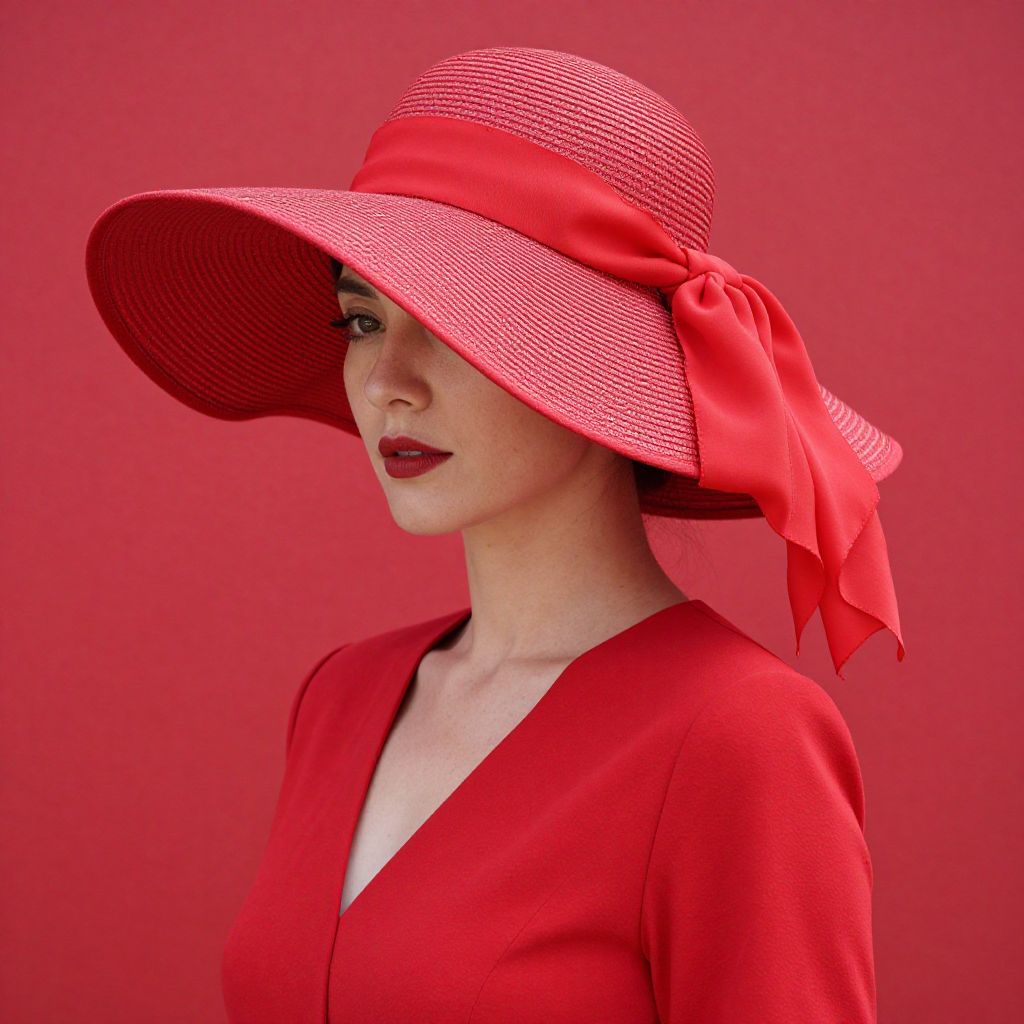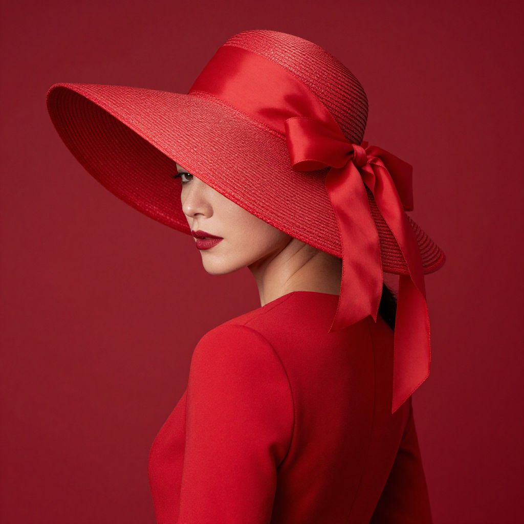Woman donning a striking all-red ensemble, featuring a wide-brimmed hat adorned with a vibrant red ribbon, exudes elegance against a bold red backdrop.