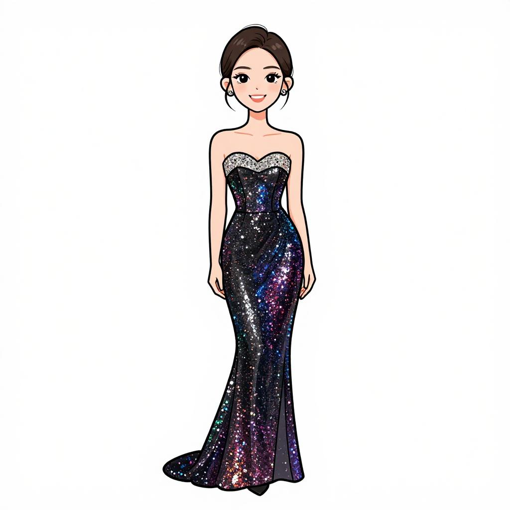 Woman with pretty face and pretty hair. smiling Woman, evening glamour, strapless floor-length gown, gradient sequin embellishments creating a celestial motif, fitted silhouette, straight neckline, black color base blending into silver accents, hair in a sleek updo, stud earrings, plain white studio background --sref 1467