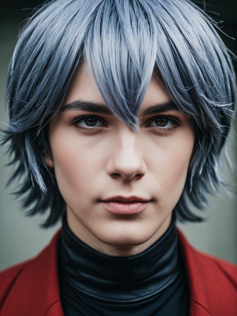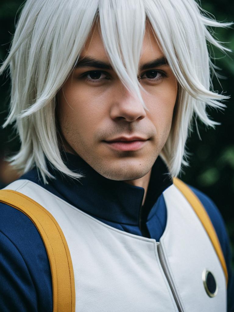 Close-up detailed headshot of a young man with styled silver-white wig, dressed in an Anya cosplay outfit featuring a black high-collared jacket with white trim and a prominent red button. The subject exhibits a serious expression with sharp facial features and brown eyes.