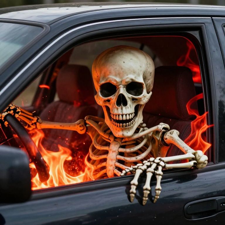 Photograph of a skeleton with glowing orange flames behind it, sitting in the driver's seat of a black car.