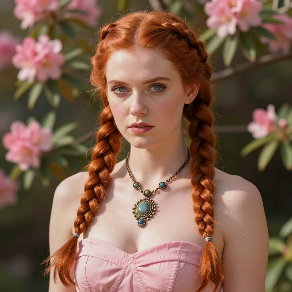 Photograph of a young woman with long red hair in two braids, wearing an off-the-shoulder white lace dress, light skin, blue eyes, and a silver necklace with a pearl pendant. White blossoms in the background. She looks directly at the camera with a neutral expression.