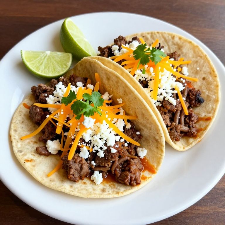 Two perfectly assembled beef tacos de birria presented on a white plate, garnished with crumbled cotija cheese, vibrant orange shredded cheddar, fresh cilantro, and lime wedges, showcasing the rich flavors and textures of Tijuana's renowned taqueria.