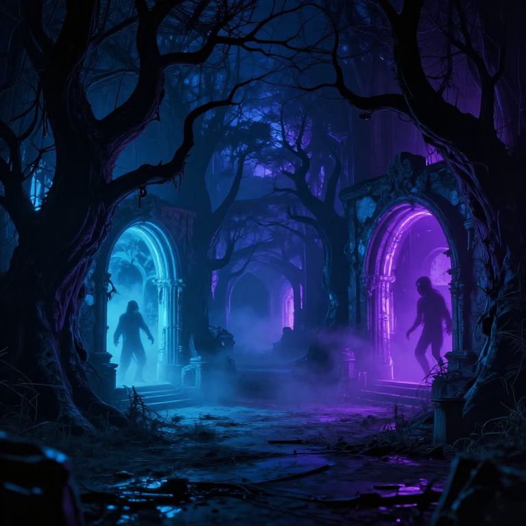 Digital artwork of a dark, misty forest with glowing blue and purple arches; silhouetted figures emerge from neon-lit portals amidst twisted