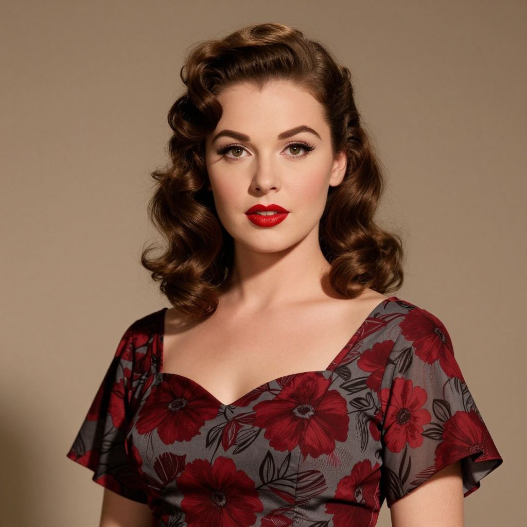 The image is a super high-resolution photograph of a beautiful pin-up woman from the 1950s, exuding elegance and grace. Her hair, styled in voluminous curls, frames her face perfectly, cascading down in soft waves that add a touch of vintage charm. She is adorned in a detailed, vintage dress with a floral pattern, featuring a deep red hue that contrasts beautifully with the gray tones of the fabric. The dress has a fitted bodice and flared sleeves, accentuating her figure. Her makeup is meticulously applied, with bold red lipstick that stands out against her fair skin, and defined eyebrows that enhance her expressive eyes. The lighting is warm and soft, casting gentle shadows that highlight the contours of her face and the intricate details of her attire. The overall composition is balanced, with the woman centrally positioned, drawing the viewer's attention to her striking features and the timeless beauty of her attire.