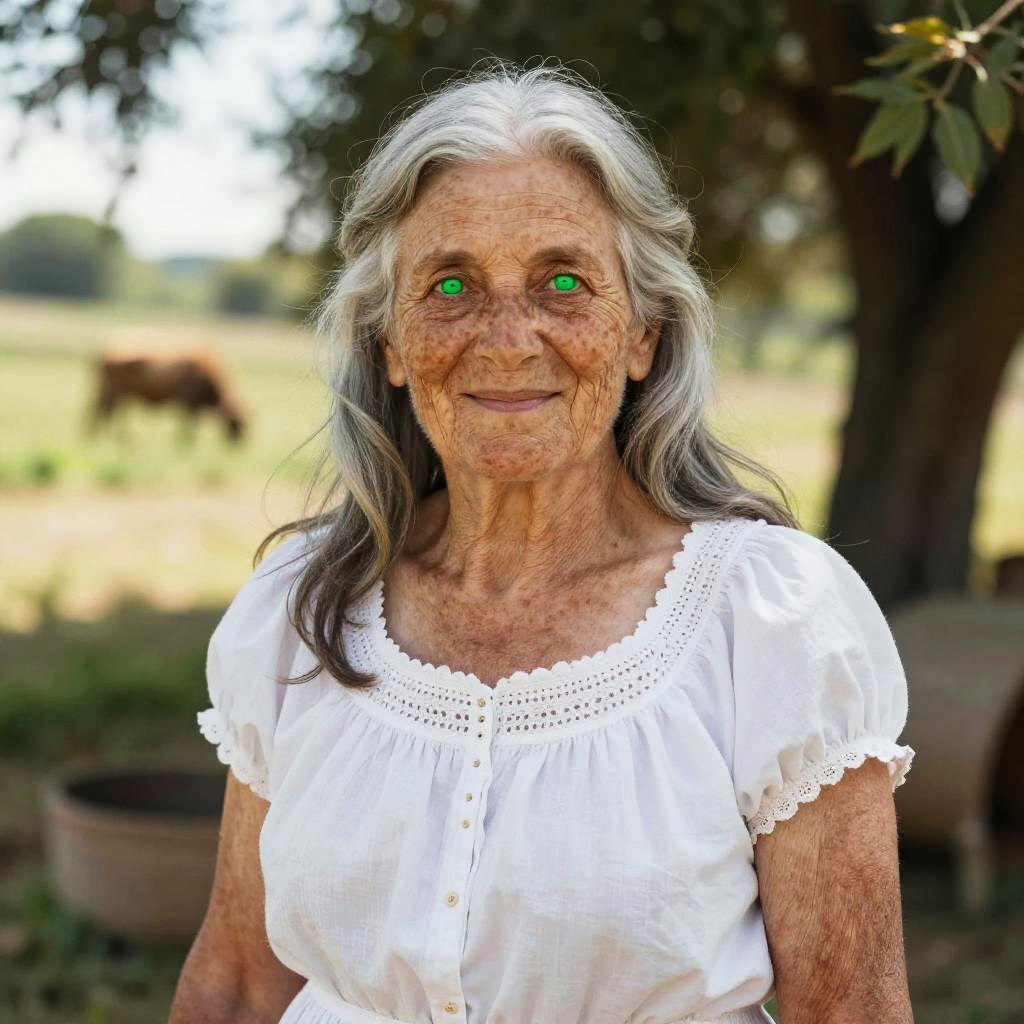 Portrait of an elderly woman with a prominent moon shaped birthmark beneath her eye, soft natural lighting highlighting wrinkles and wisdom, calm expression, background of a twilight sky with a crescent moon, warm emotional tone, photographic realism
